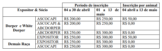 Os criadores interessados em participar tem até às 16h do dia 13 de maio para inscreverem seus animais através da área de sócio do site da ARCO. Confira abaixo tabela de preços de baias e inscrição de animais para julgamento.